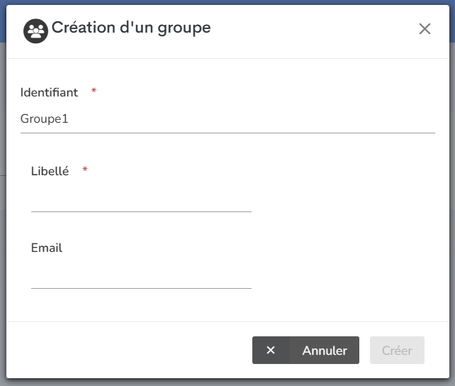 L’écran de création ou de mise à jour d’un groupe met clairement en évidence tous les champs obligatoires. Le bouton “Créer” ou “Enregistrer” reste inactif tant que tous les champs obligatoires n’ont pas été remplis.