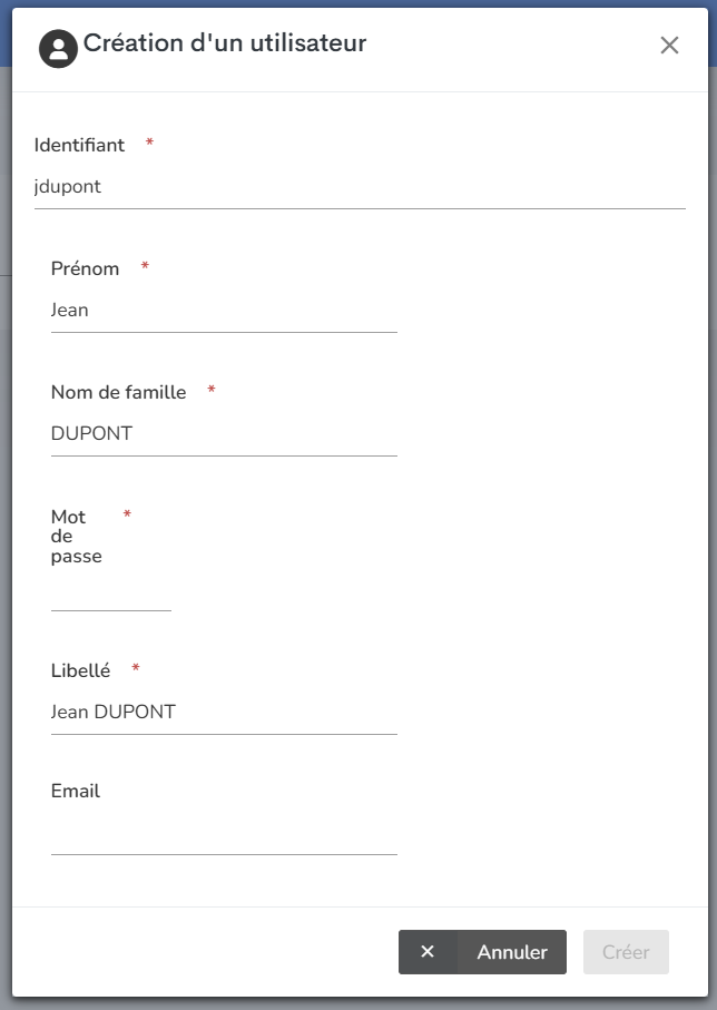 L’écran de création ou de mise à jour d’un utilisateur met clairement en évidence tous les champs obligatoires. Le bouton “Créer” ou “Enregistrer” reste inactif tant que tous les champs obligatoires n’ont pas été remplis.